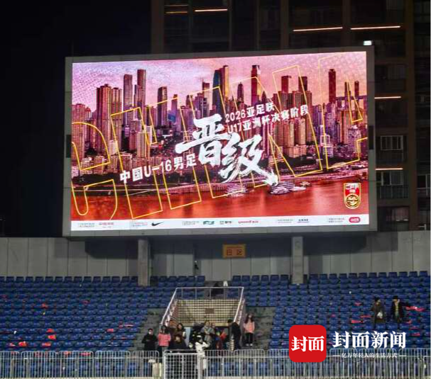 11月30日晚,铜梁龙浮现场播放祝愿国足闯进U17亚洲杯海报(马嘉豪 摄)