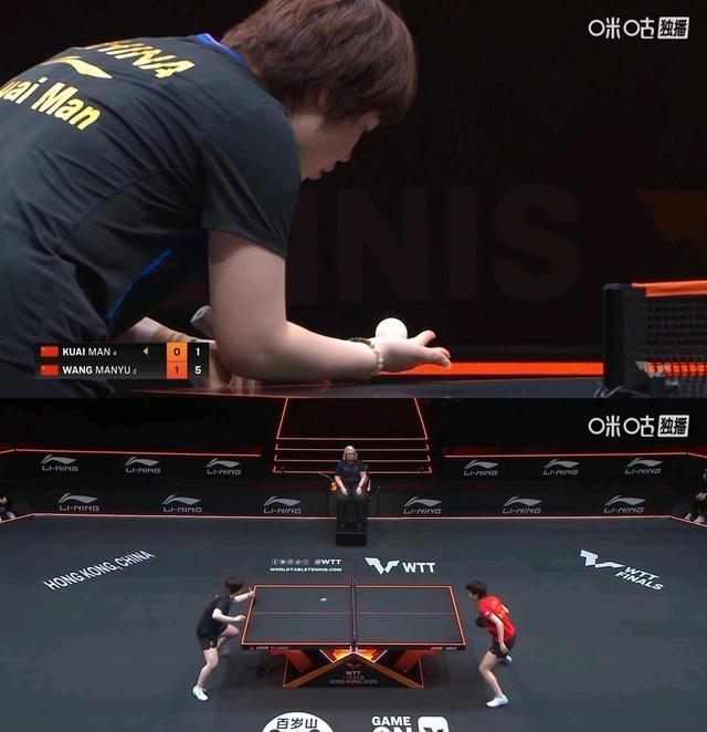 在本年的交手里,蒯曼赢过王曼昱2次,靠的便是发、接发这几板的冲击。这回她继续这样干,用不同旋转、不同落点去咬住对方的节律。