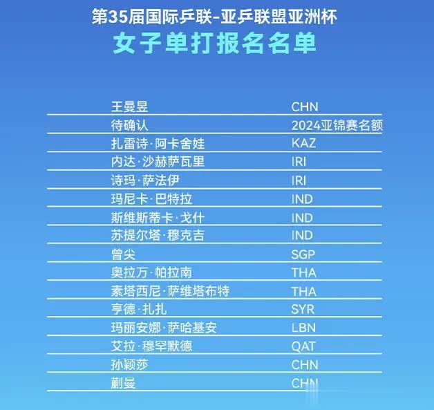 2026年亚洲杯的比赛,还有一个月就要打响,今天凌晨,亚乒联亦然公布了此次参赛的参赛的32东说念主大名单,除了卫冕冠军王楚钦和王曼昱除外,中国对其他的参赛东说念主员,也还是阐述了,备受暖热的孙颖莎,此次亦然阐述参赛!