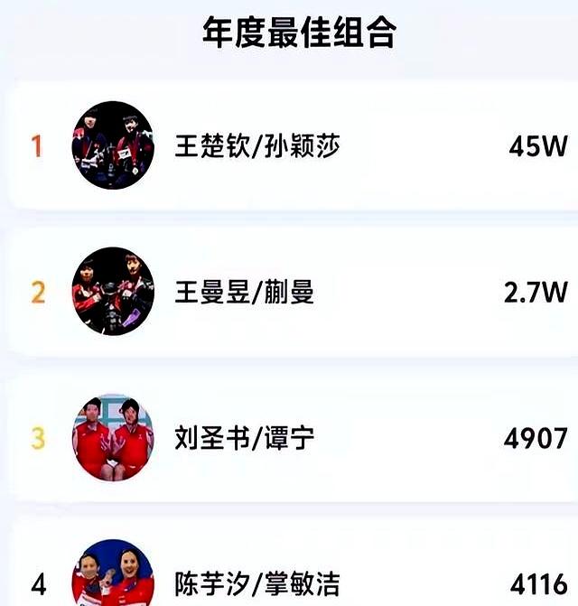 王楚钦拿下最好男通顺员,世乒赛男单冠军、WTT三冠王、最好时刻、最好组合……孙颖莎更是“收割机”,年度最好女通顺员、社媒最受迎接通顺员、最好组合,11个冠军头衔,距离大满贯只差奥运女单金牌。
