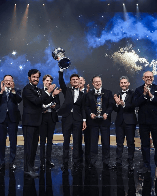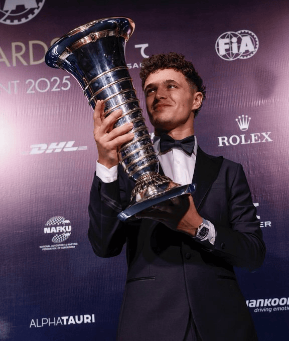 虎扑12月13日讯海外汽联2025年度受奖庆典在乌兹别克斯坦齐门塔什干举行,迈凯伦车手兰多-诺里斯在庆典上领取了2025年度F1车手总冠军的奖杯。