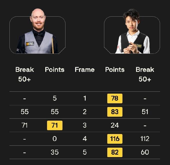 虽然,晋级的说念路上也留住了缺憾。 除了赵心童和斯佳辉,王雨晨0比4不敌马克·艾伦,贺国强相似0比4输给塞尔特,庞俊旭则以1比4负于凯伦·威尔逊。 中国军团在第二轮获取了6胜8负的战绩。