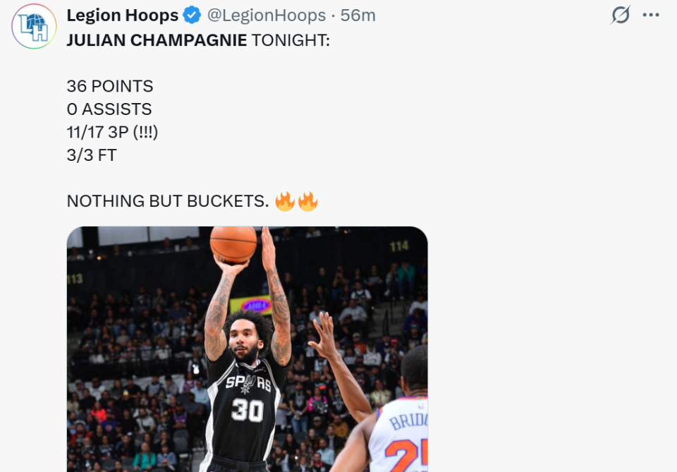 凭借这么的弘扬,尚帕尼36分创造个东说念主生存单场得分记载,同期单场11记三分刷新马刺队史记载(此前记载为9个)。