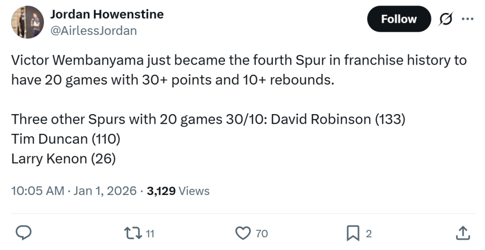 同期本场比赛是文班生存第20场单场至少拿下30分10板,照旧升至马刺队史第四,仅次于大卫罗宾孙(133)、邓肯(110)和拉里肯农(26场)。