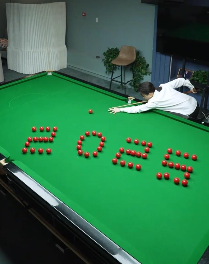 视频显现,站在一张斯诺克台球桌前,桌上的几十颗红球摆成“2025”字样。她将母球开出,球履历漫长的5次吃库后,精确地撞到数字“5”中的一个球,将它酿成“6”,桌面上的数字也成了“2026”。她配文写说念:“2026,新年源流,步步登高。”
