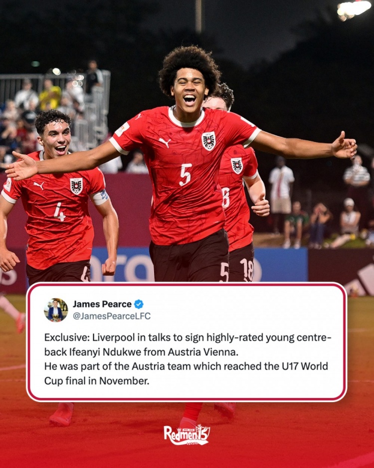 1月3日讯 据Theathletic报谈,利物浦正在和奥地利维也纳洽谈,但愿签下备受瞩沟通年青中后卫伊费阿尼·恩杜克韦(Ifeanyi Ndukwe)。这名奥地利后生队国脚要到3月才满18岁,但赤军但愿能在7月开启季前磨砺时完成转会。