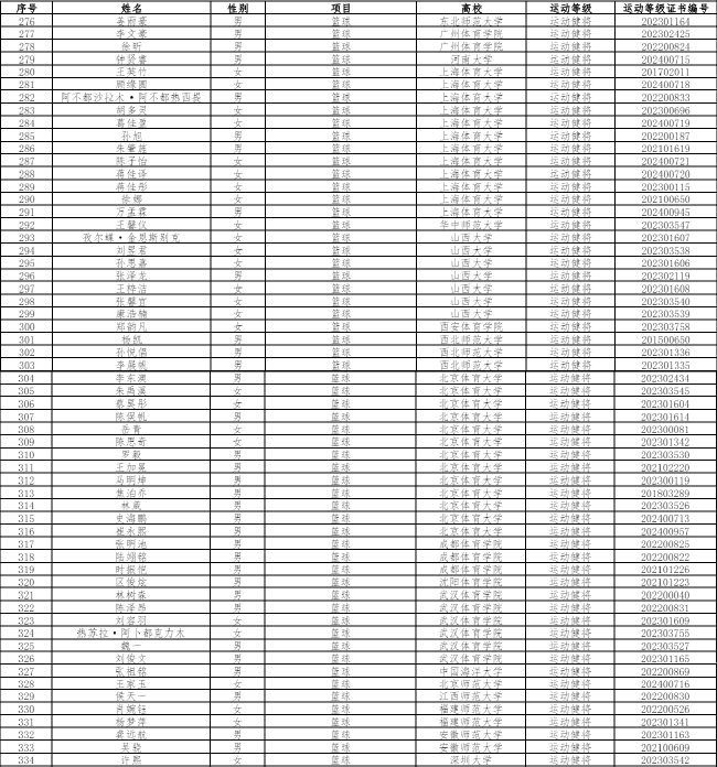此外,来自CBA广州队的焦泊乔、崔永熙,来自CBA南京同曦队的林葳拟定保送北京体育大学。这次共有1180名通顺员通过审核保送,名单公示时期为2024年6月3日至7日。