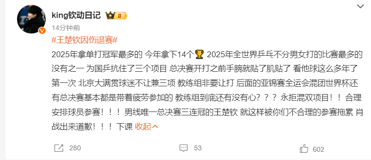 许多的球迷齐认为王楚钦给与退赛是对的,有了伤病就该保护我方,刚刚打完混团天下杯又来总决赛兼项,莎头两东说念主齐太累了,王楚钦该好好休息。