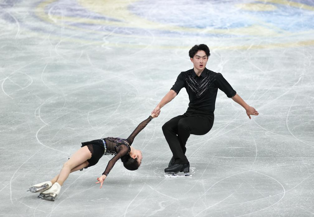 12月4日,中国组合郭蕊(左)/张益文在后生组双人滑短节目比赛中。新华社记者 岳晨星 摄