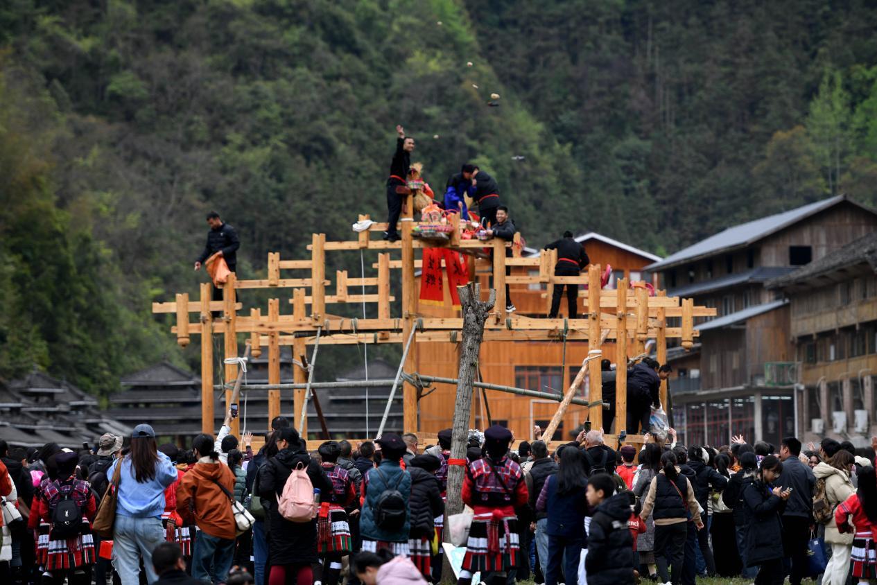 图为搭客在干涉黄洛瑶寨抢粱粑风尚体验行为