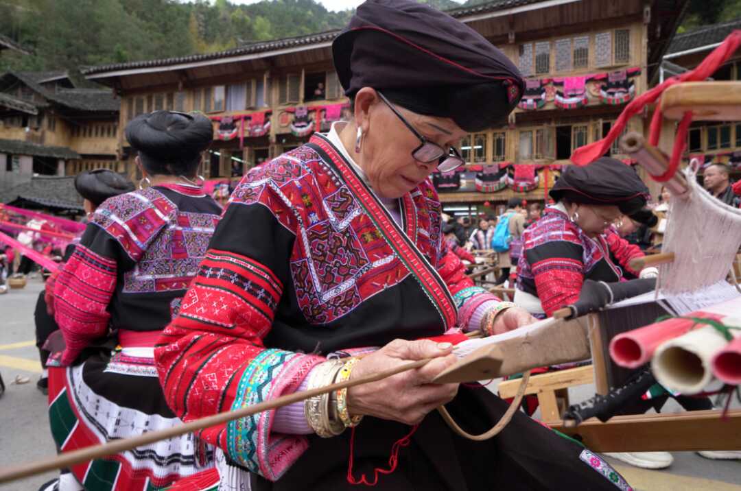 图为黄洛瑶寨的瑶族妇女在干涉风尚巡游行为