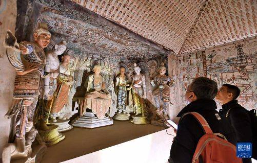 3月29日,不雅众在参不雅“如是莫高”敦煌艺术大展中展出的莫高窟第45窟的复刻版块。