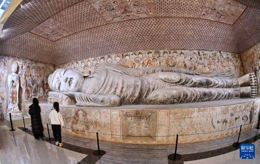 3月29日,不雅众在参不雅“如是莫高”敦煌艺术大展中展出的莫高窟第158窟的复刻版块。