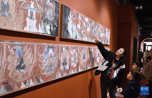 3月29日,不雅众在参不雅“如是莫高”敦煌艺术大展中展出的莫高窟第285窟的复刻版块。